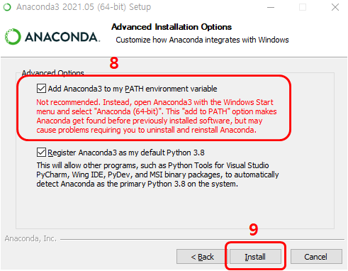 8. 나의 환경 경로에 아나콘다를 추가하는 버튼을 반드시 눌러줍니다.