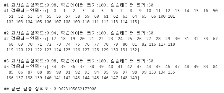 print('\n#{} 교차검증정확도:{}, 학습데이터 크기:{}, 검증데이터 크기:{}'.format(n_iter, accuracy, train_size, test_size))